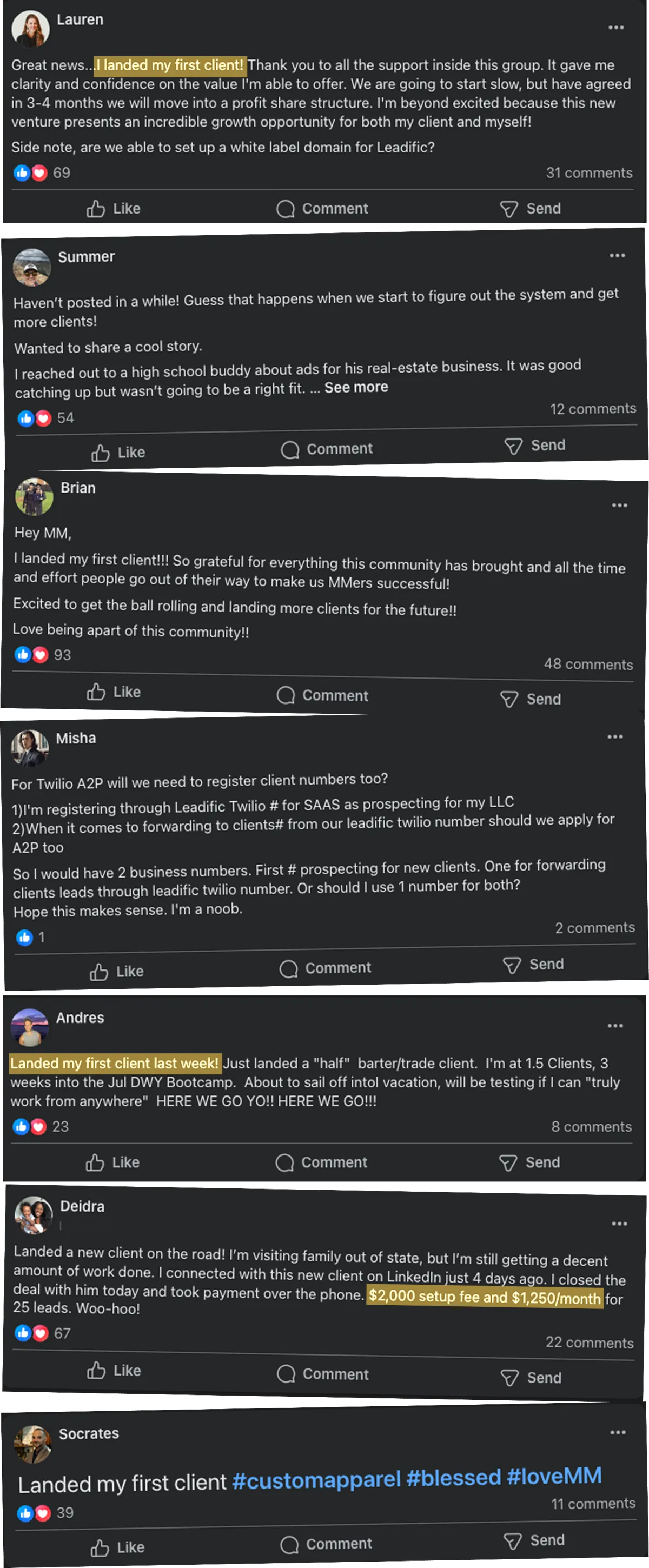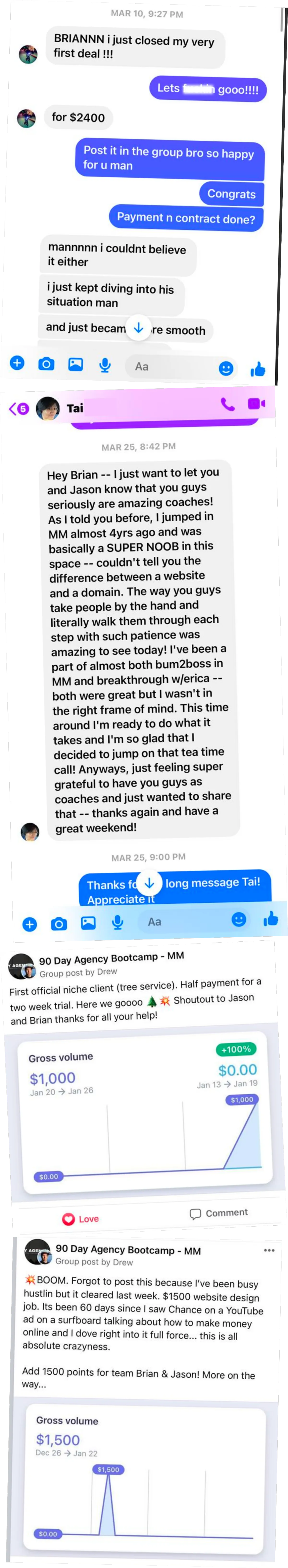 Emily was freelancing while working a job, but she craved full freedom. In Feb, she quit her job - without a steady income - to go all in on her business. Within weeks of joining the program, she landed her first client via a Facebook post ($1,000 setup + rev share). Shortly after, she closed a second one with a $2,000 setup. Now, she's confidently pitching high-ticket offers and delivering real value - just like she once imagined.